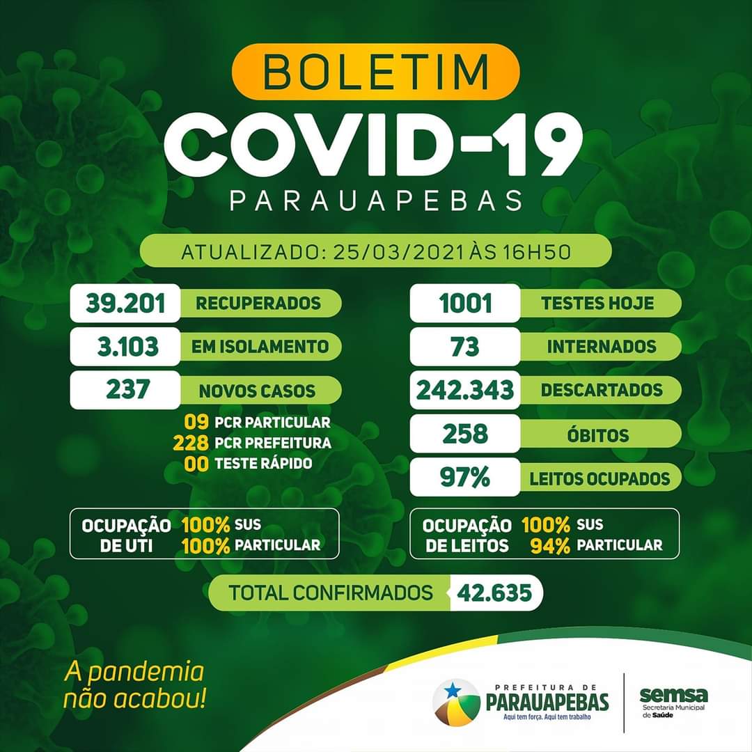 Nesta quinta-feira, 25 de março, foi notificado 237 novos casos de Covid-19.