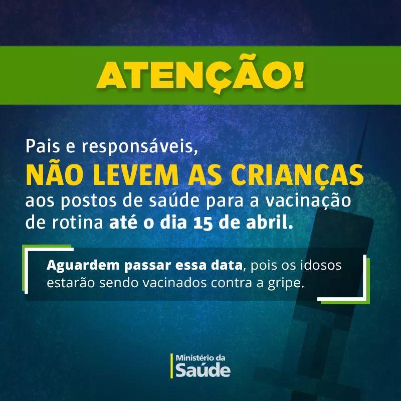 Assim, a recomendação é que pais e responsáveis por crianças aguardem o término desta fase e, a partir do dia 16 de abril, voltem às unidades de saúde para realizar a vacinação de rotina. Esta medida, se estende também para população adulta, contemplada no calendário nacional de vacinação. Contudo, para Estados com circulação ativa do vírus de sarampo e febre amarela, é recomendada a continuidade da vacinação para as duas doenças, e que estas estratégias ocorram de forma planejada afim de evitar concentração de pessoas.