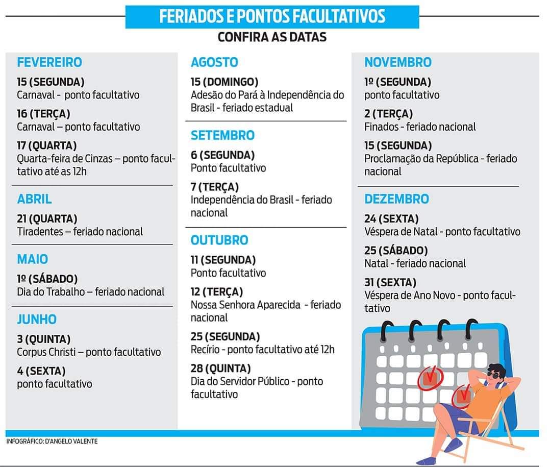 O Governo do Pará divulgou ontem, no Diário Oficial do Estado (DOE), os feriados nacionais, estaduais e pontos facultativos para 2021, a serem cumpridos por órgãos e entidades da administração pública direta e indireta.