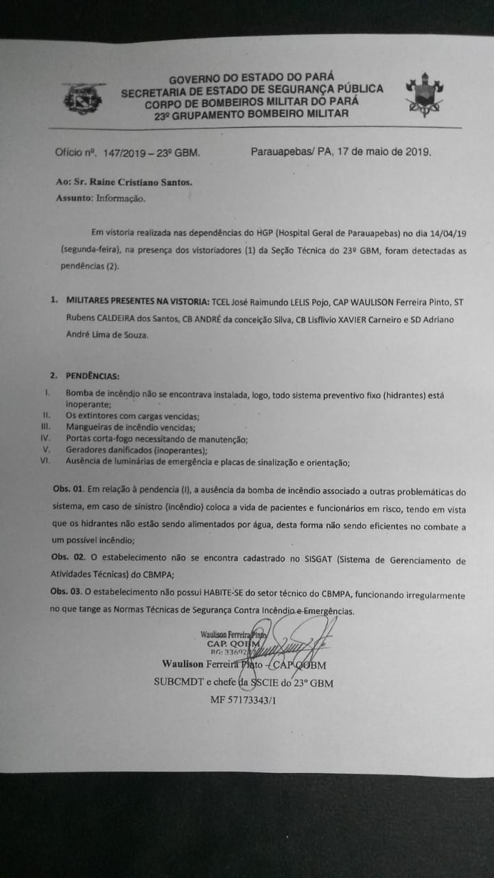 Outra problemática grave, é que, se ocorrer, um incêndio, dentro da unidade, será difícil para contê-lo, devido o mal funcionamento da rede de hidrantes e sua bomba de incêndio não instalada, logo, todo sistema preventivo fixo está inoperante: extintores com cargas vencidas, mangueiras de incêndio vencidas, portas corta-fogo necessitando de manutenção, geradores danificados e inoperantes, ausência de luminárias de emergência e placas de sinalização e orientação; O estabelecimento não se encontra cadastrado no SISGAT ( Sistema de Gerenciamento de Atividades Técnicas) do CBMPA, e, também não possui HABITE-SE do setor técnico do CBMPA, no que tange às Normas Técnicas de Segurança Contra Incêndio e Emergência. Todos estes fatos constatados em vistoria pelo (23°) Grupamento do Corpo de Bombeiro Militar de Parauapebas/Pará, devido Denúncia protocolada na corporação. A denúncia relata que, no dia 09/04/2019 em período noturno durante uma forte chuva, colaboradores e usuários teriam se assustado com o forte cheiro de fumaça, que se espalhou pela unidade hospitalar devido com um curto circuito, numa unidade de distribuição elétrica externa.