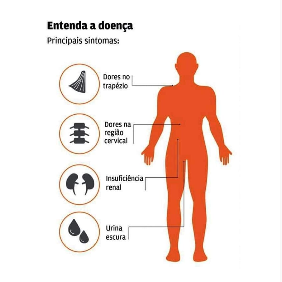 Ocorre extrema rigidez muscular de forma repentina, dores musculares, dor torácica, dificuldade para respirar, dormência, perda de força em todo o corpo e urina cor de café, pois o rim tenta limpar as impurezas, o que causa uma lesão na musculatura. A doença causa muitas dores musculares, lembrando a dengue, porém sem febre.