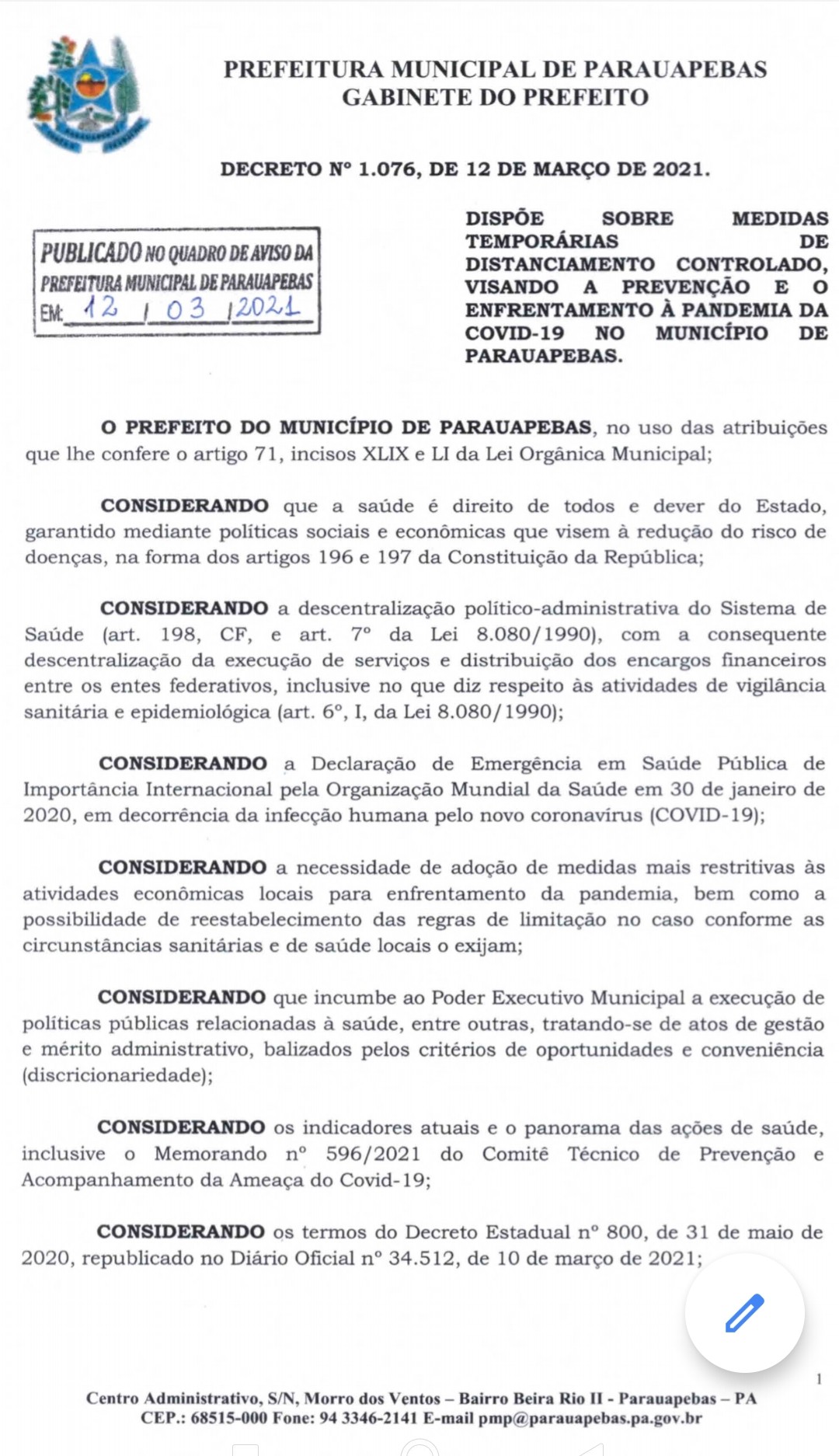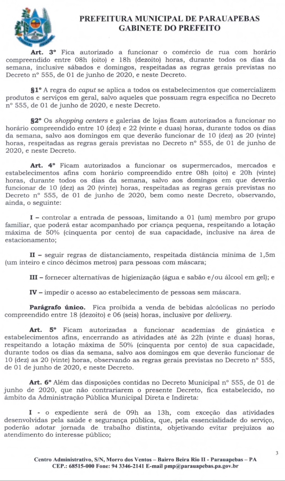 No âmbito da prefeitura, o atendimento presencial ao público está suspenso e passa a ser remoto de acordo com os contatos informados no site da prefeitura no www.parauapebas.gov.pa.br